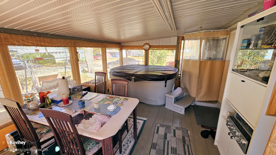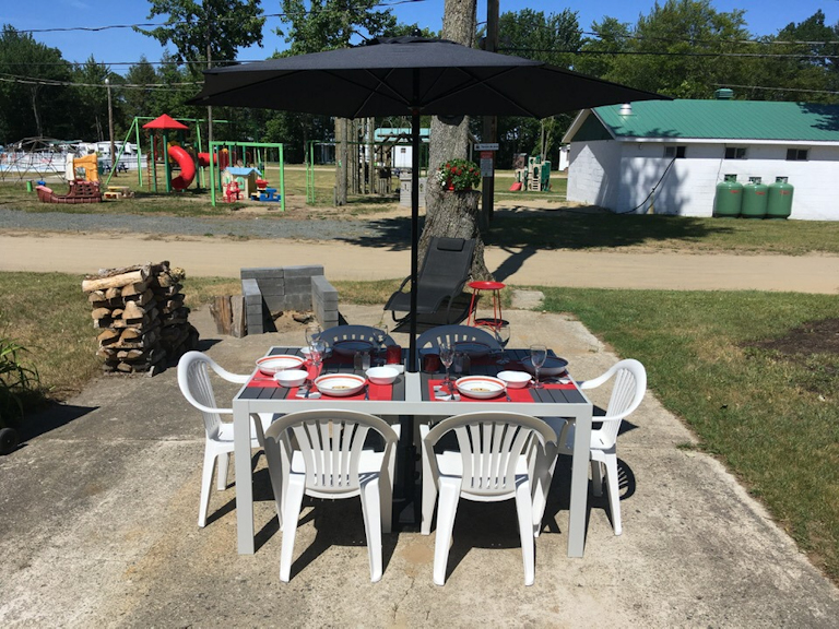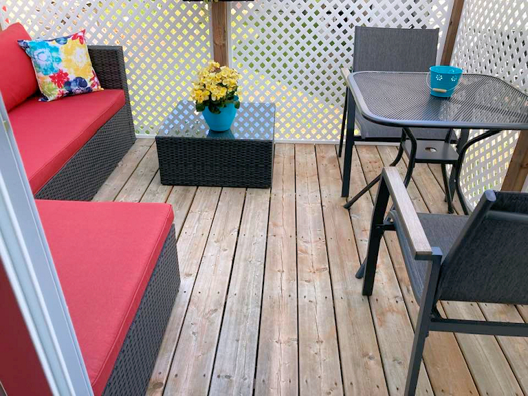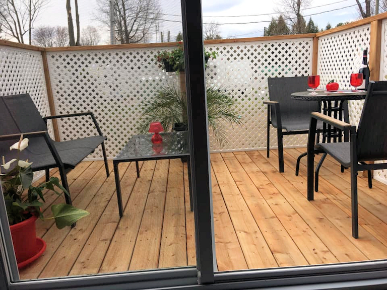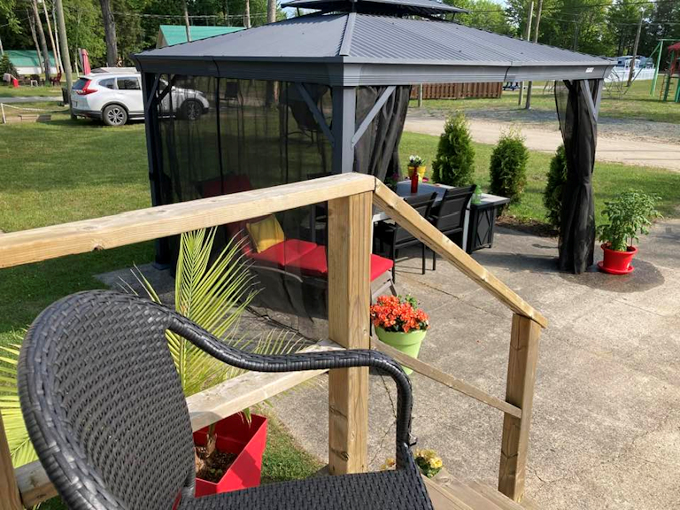 Ensemble patio (6 chaises), télé, foyer électrique, petit frigo, chauffe terrasse au plafond, 4 toiles pare-soleil de 6 pieds et bien plus